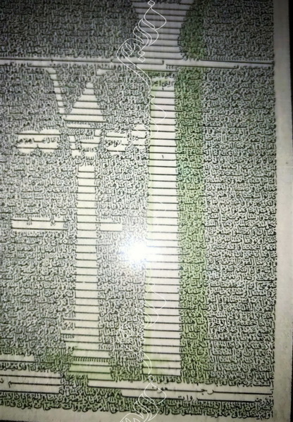 فن الخط العربي مخطوطة طبعة محدودة. اللوحة الثالثة. القاهرة نصوص من القرآن الكريم تشكل عن بُعد مناظر ومخططات من خلال مدود بين الأحرف وتفتيح أو تغميق الكتابة. المنظر: منظر المسجد النبوي والحصوة والحديقة التي كانت بها وكان يُطلق عليها "بستان ستنا فاطمة" النص: بقية الجزء السادس والجزء السابع والثامن وبداية الجزء التاسع من القرآن الكريم . إطار خشبي مذهب من مقتنيات الوالدة أم الخير أحمد قطب رحمها الله