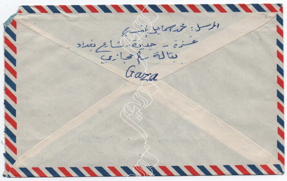 "1969م مغلف تاريخي نادر فلسطين ـ غزة أنشأت في أعقاب حرب الستة أيام وبعد احتلال إسرائيل للضفة الغربية وغزة قناة ترانزيت لتوصيل بريد أهل فلسطين إلى أسرهم في السعودية والعكس فكانت تصل رسائلهم بطوابع إسرائيلية وأقوم بتحويل رسائلهم المغلقة ببريد ألماني إلى السعودية هذان مغلفان بعنوان رفيق السكن نبيل سويدان استمرت قناة الترانزيت من 1969 إلى 1972م وفي مجموعة ""وثائقية آل إلياس"" عدد كبير منها باسمي"