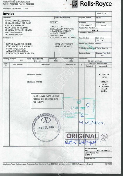 وثيقة فاتورة مبدئية لقطع غيار للسلاح الجوي