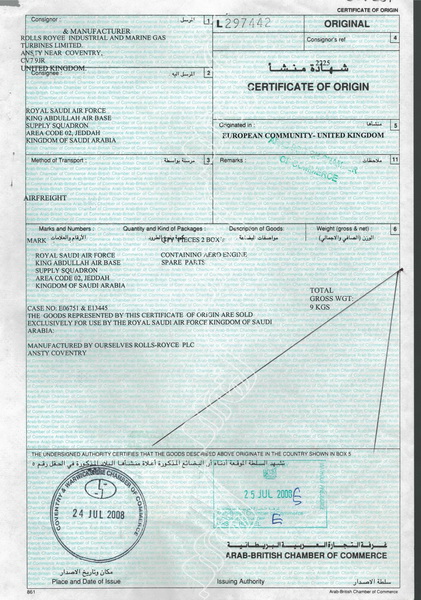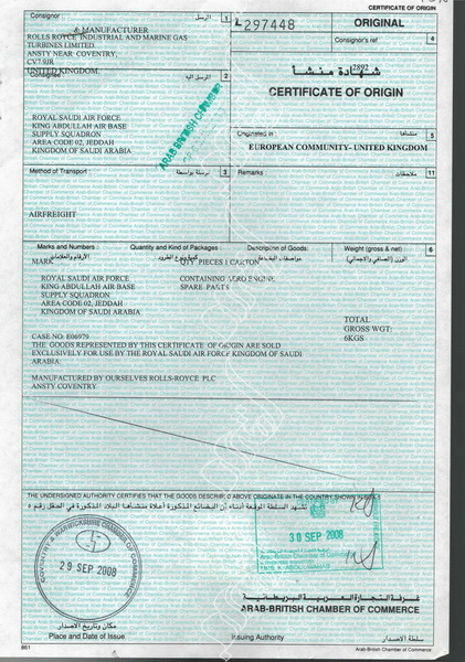 وثيقة شهادة منشأ لقطع غيار للسلاح الجوي