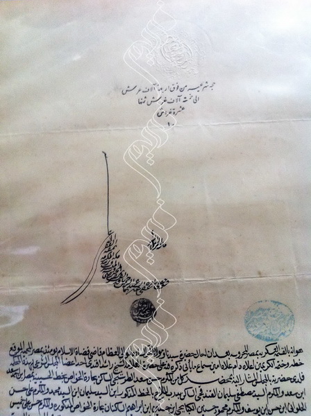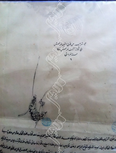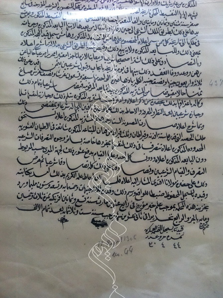 "رجب 1306 صك شرعي يلاحظ من شراء المرأتين لهذه الأرض الزراعية في عام 1889 م الأهلية التجارية والاجتماعية للمرأة منذ ذلك العصر ويلفت النظر طغرة القاضي وطريقة الكتابة وفن الخط المراعى في الحياة اليومية ورد ذكر مكة المكرمة في نص الصك إطار خشبي أسود 12 رجب 1306 هـ (1889.03.14 م)"