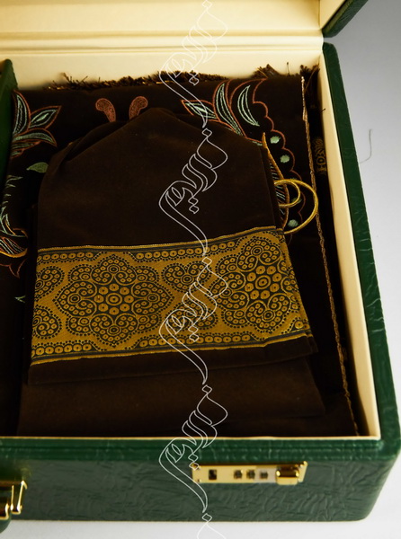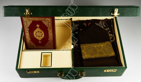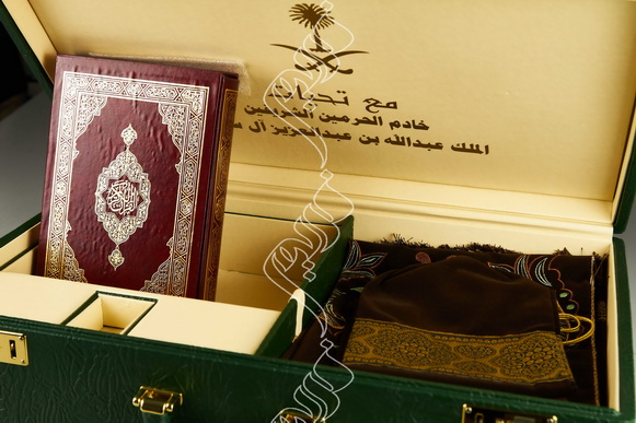 "عام 1429 هـ علبة إهداء مهداة من الملك عبد الله بمناسبة المؤتمر الإسلامي العالمي للحوار بمكة المكرمة 1429 (2008م) المحتوى: مصحف، قطعة من كسوة الكعبة المشرفة، سجادة صلاة مع بوصلة، وساعة يد "
