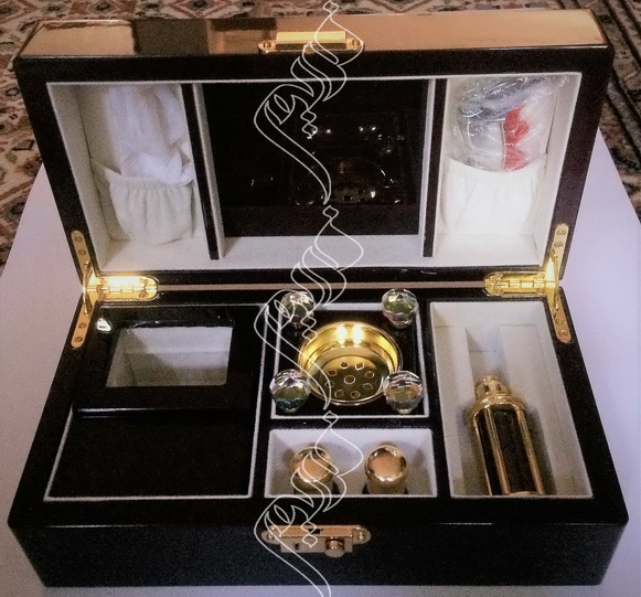 عام 1436 هـ (2015م) علبة علبة خشبية مطعمة بأنواع مختلفة من الخشب، ومبطنة بقماش أبيض المحتوى: دهن وبخور عود ومسك