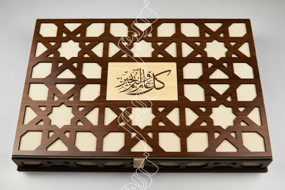 عام 1437 هـ (2016م) علبة إهداء علبة مقواة مع زخارف خشبية النص: كل عام وأنتم بخير إهداء المحتوى: تمر