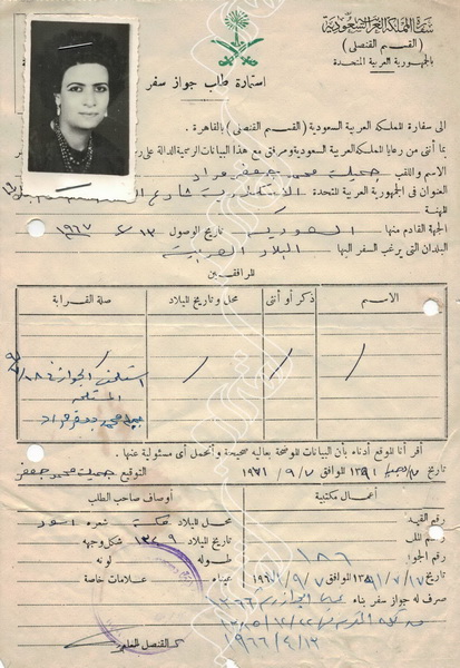 وثيقة طلب إصدار جواز سفر للقنصلية السعودية في القاهرة للسيدة جميلة محمد جعفر مراد