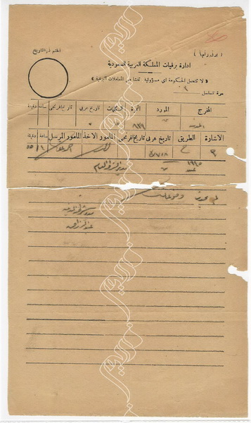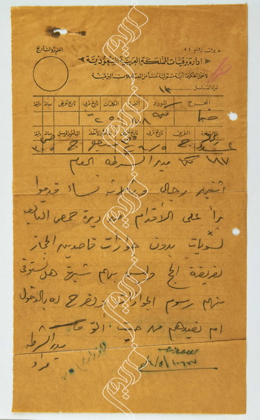 برقية من مدير شرطة ضبا إلى مدير الشرطة العام أسرة من حمص تريد الحج على الأقدام دون جوازات