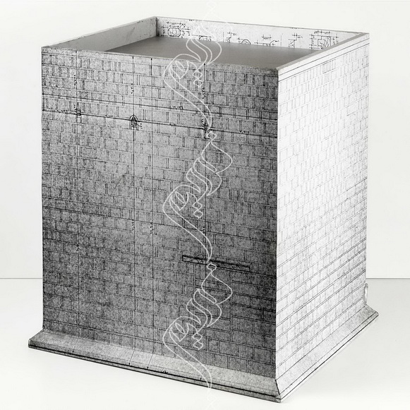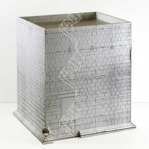 "عام 1427 هـ مجسم مجسم الكعبة المشرفة بدون كسوة قطعة أصلية نادرة جداً مخططات الترميم. نادر جداً. مقياس الرسم 1:30 يعرض هذا المجسم للكعبة المشرفة بدون كسوتها كما يندر رؤيتها. وقد قمنا بإعداده وفق المخططات التي جُهّـزت من أجل ترميمها عام 1417 هـ (1996 م)، وهو يعرض هنا لأول مرة. يُلاحظ البناء المحكم والأحجار الضخمة التي استعملت في بناء البيت الحرام، والتي قُصت من ""جبل الكعبة"" على حافة وادي إبراهيم عليه السلام. ويمكن رؤية المدخل الثاني للكعبة المشرفة في جدارها الغربي والذي سدّته قريش عند بنائها للبيت قبل البعثة النبوية. "