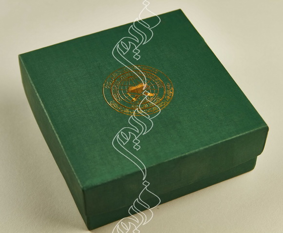 عام 1427 هـ (2006م) علبة إهداء لوحة تذكارية البريد السعودي بمناسبة إصدار اليوم العالمي لحقوق الإنسان علبة مكسية بجلد صناعي ومبطنة بقماش أبيض درع مصور عليه صورة الإصدار