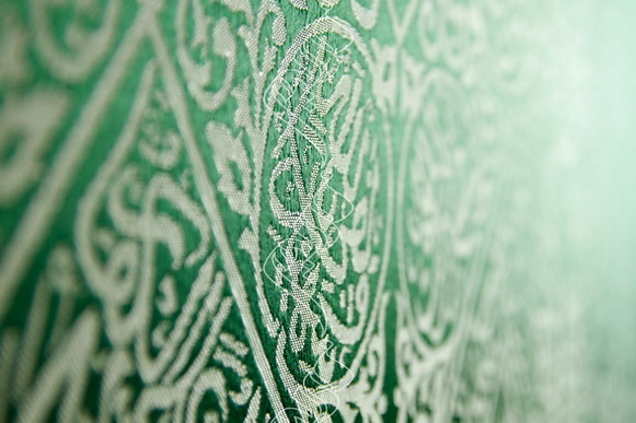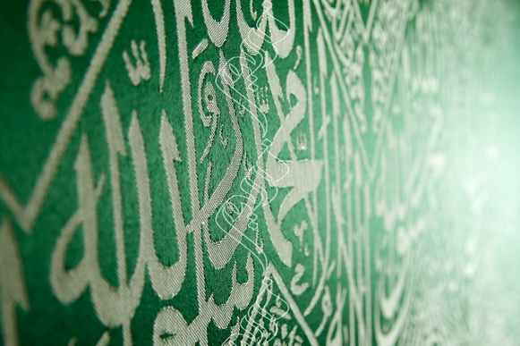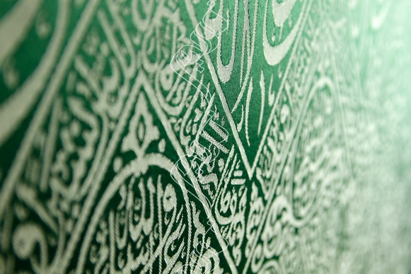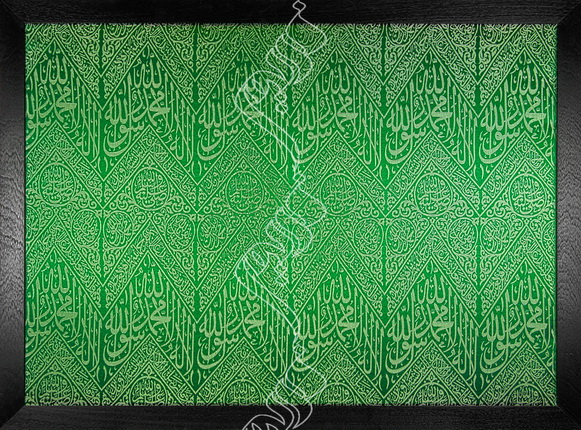 "كسوة القبر النبوي الشريف قطعة أصلية نادرة جداً حرير أخضر ناعم، محلىً بكتابات من أصل النسيج. قطعة نادرة جداً من الكسوة الداخلية لقبر الرسول صلى الله عليه وسلم. تغطي هذه الكسوة جدران الغرفة الصماء التي تحيط بالقبر الشريف دون باب ولا منفذ، وتغيّر كل خمس إلى ثمان سنوات. النصوص: محمد رسول الله والذين معه أشداء على الكفار رحماء بينهم تراهم ركعاً سجوداً (الفتح 28) ـ لا إله إلا الله ـ محمد رسول الله ـ صلى الله عليه وسلم إطار خشبي أسود من مقتنيات المجمع العالمي. إهداء مشكور من مبرة الشيخ محمد عطا إلياس يرحمه الله للأعمال الخيرية."
