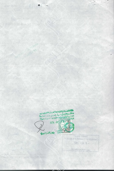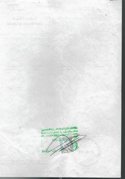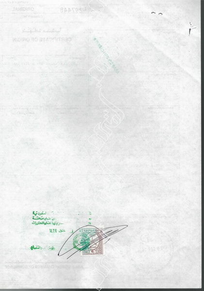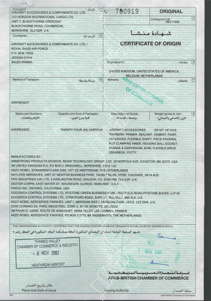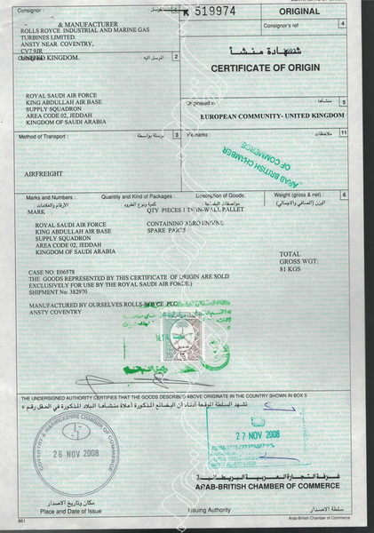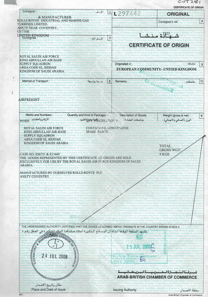 وثيقة شهادة منشأ لقطع غيار للسلاح الجوي